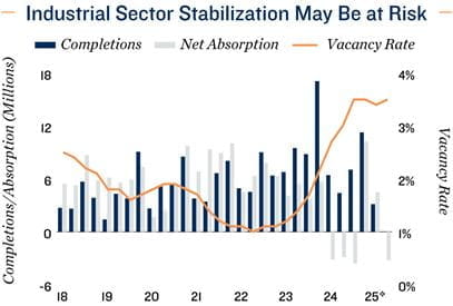 Industrial a sector to monitor. After 2.5 years of softening fundamentals, Canada’s industrial sector began to stabilize late last year. In the first quarter of 2025, the nation’s vacancy rate actually fell 10 basis points to 3.4 per cent, marking the first quarterly drop since mid2022. Declining interest rates caused Canada’s economy to gain momentum, which in turn drove healthy absorption levels over the past two quarters. Yet despite growing momentum, Canada’s industrial sector is still the most exposed to ongoing tariff uncertainties. Preliminary estimates for the second quarter indicate negative net absorption and vacancy returning to a rising trajectory, as both business and consumer confidence has plunged. Manufacturing activity showed weakness to start the year due to this same reason, while e-commerce sales have also fallen for three consecutive months as of March. All of this points to softening space demand, suggesting further rebalancing in Canada’s industrial sector amid ongoing trade risks. Consequently, vacancy is forecast to rise to the 4.0 per cent range