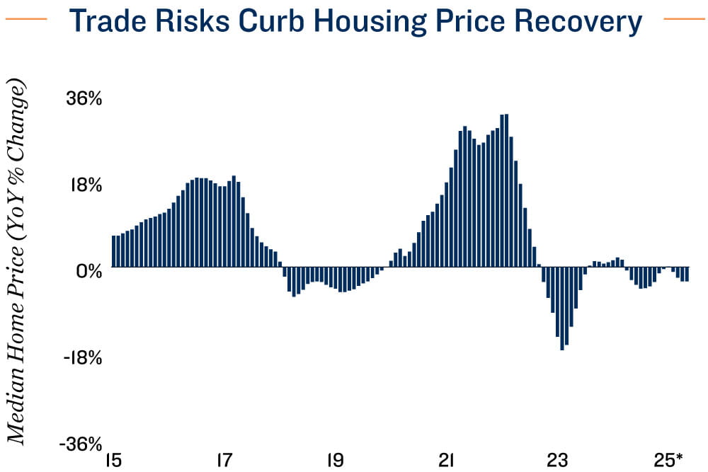 Breath of life seen in housing sector. Canada’s residential market has been under pressure throughout the first half of 2025. Affordability challenges and ongoing trade uncertainties have tempered buyer confidence despite lower borrowing costs. As of May, year-to-date homes sales were down 11 per cent, curbing the price recovery that had started to build over the latter parts of last year. Yet as Canada came out of April’s “Liberation Day” and subsequent adjustments relatively unscathed, home sales rose 3.6 per cent monthly in May. Although still down 3.0 per cent year over year, the average price of a single-family home also showed some stabilization as a result. Meanwhile, early reports suggest Canada and the United States are closing in on a trade agreement. Along with lower borrowing costs helping affordability, this could fuel further momentum over the rest of 2025.