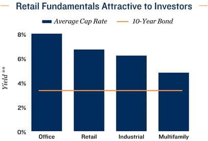 Retail yields attractive in current environment. Canada’s population has increased by 11 per cent since the start of 2019, helping to drive a 33 per cent rise in retail sales. This has in turn fuelled retail space demand, as a total of 33.5 million square feet were absorbed on net in that time. Combined with the pandemic and construction feasibility challenges, retail property supply has only increased by 3.0 per cent. As a result, Canada’s retail vacancy rate is now at an all-time low of 1.5 per cent. At the same time, the average retail cap rate sits just below 7.0 per cent. Given elevated borrowing costs, the property type is attractive to investors on the hunt for yield.