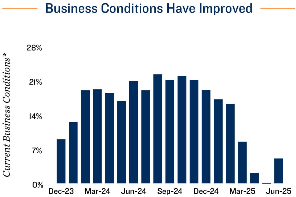 Business sentiment improves, but sales outlook stays weak. As of June, the worst-case tariff scenarios first anticipated by businesses looked less likely to appear, leading to a slight recovery in business sentiment in the Bank of Canada's Business Outlook Survey. Preferential treatment under the USMCA allowed tariff exemptions for the majority of surveyed firms – particularly exporters, who saw a more pronounced improvement in their outlook through June. Yet broader sales indicators weakened notably, reflecting growing concerns about a slowing economy stemming from the impact of tariffs. The Indicator of Future Sales (FSI) fell to a six-quarter low, reinforcing expectations that GDP growth slowed in the second quarter.