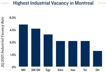 Quebec under pressure from higher tariffs. With a large production base, Quebec saw total manufacturing sales fall in May to their lowest level since December 2021, despite a 4.5 per cent increase in aerospace product and parts shipments. While refinery shutdowns contributed to this weakness, broader softness across key industries – including primary metals and chemical products – also weighed on overall performance. The province’s outsized exposure to tariff-sensitive sectors and export-oriented manufacturing made it more vulnerable to trade disruptions. As a result, Quebec’s industrial sector remains under greater pressure compared with other provinces. Montreal’s vacancy rate reached 5.1 per cent in the second quarter – the highest among major Canadian metros. In the investment market, this weakness likely influenced transaction activity as well. Preliminary second-quarter data shows the number of deals fell by 67 per cent and dollar volume dropped by 70 per cent year over year in Montreal – the sharpest declines among eastern metros.