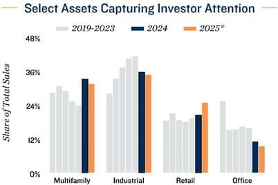 Sales holding up. Commercial real estate transactions bottomed in the third quarter of 2024. Bond yields then began to stabilize and in some cases come down, while Canada’s economy also gained momentum. Combined with prices recalibrating, sales activity has been picking up. Tariff uncertainties stalled this recovery in the early parts of 2025, yet with the total number of sales ticking up slightly in the second quarter, it appears a more gradual rebound could still materialize. With commercial real estate generally offering stability, along with a less restrictive lending environment and more favourable pricing, some confidence may be returning to the sector. Essential-retail, apartments and industrial continue to generate positive sentiment.