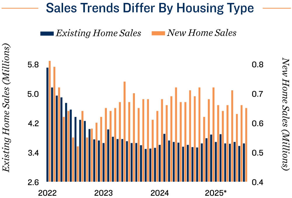 Encouraging and discouraging trends at play in housing. Existing home sales increased 1.1 percent year over year in July 2025 to a six-month high, aided by a steadily climbing number of listings. The supply of homes at the current sales pace has eased back from the May high of 4.2 months, but the liquidity measure is still at one of its highest levels in more than five years. The added options for prospective buyers has siphoned upward momentum away from home prices. In July, the median home price inched up just 0.3 percent over the past year,which was the smallest margin since late 2023. Recent downward movement in mortgage rates may further open the door for sales. The average 30-year fixed rate mortgage was at 6.58 percent in late August — down from a mean of 6.96 percent early in the year.