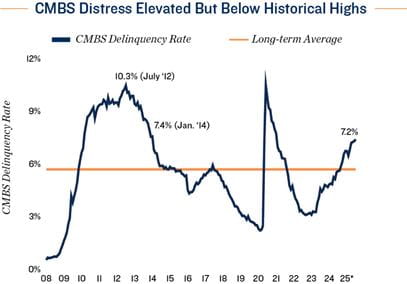 - The overall CMBS delinquency rate in July 2025 was 7.2 percent, up from 5.4 percent in July last year.