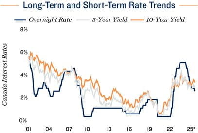 BoC cuts rate as expected in September. In line with market expectations, the Bank of Canada lowered the overnight rate by 25 basis points at its September policy meeting, bringing it to 2.5 per cent. Since its July meeting, Canada’s labour market has weakened. A loss of nearly 110,000 jobs between July and August pushed the unemployment rate up to 7.1 per cent. On the price front, despite some mixed signals, recent inflation data suggest that upwards price pressures have eased, even with higher costs from trade disruptions. Additionally, the risk of future inflation has diminished, as Canada has removed most of its retaliatory tariffs on U.S. goods. Together, these three developments have shifted the balance of risks, prompting the BoC to resume rate cuts since its March policy move