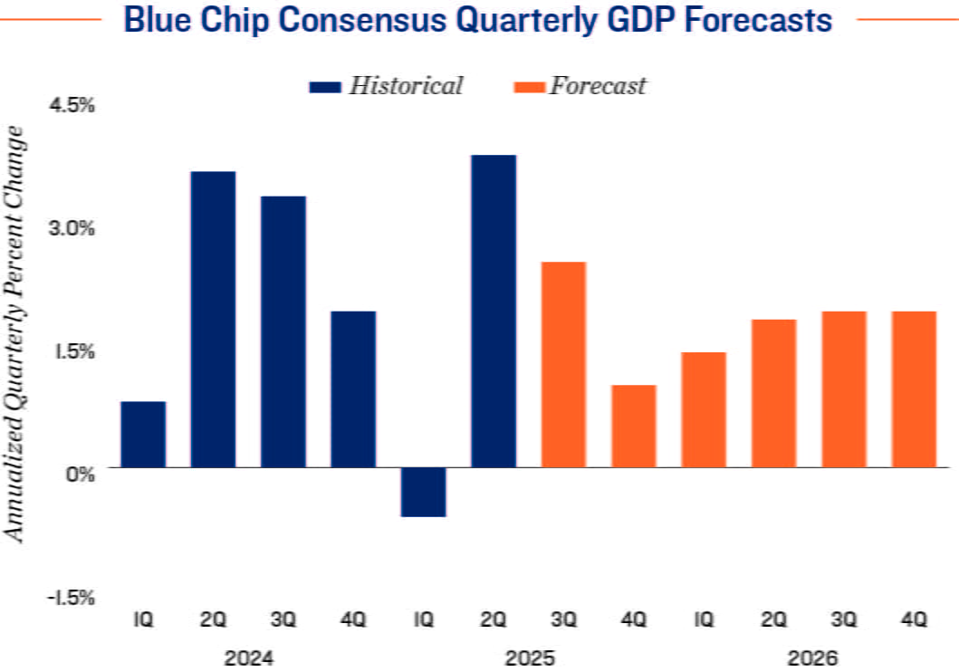 - The Blue Chip consensus forecast, representing the assessments of 44 economists, anticipates GDP growth of around 2.5 percent for the third quarter of this year, slowing to an annualized gain of 1.0 percent for the closing period of 2025.