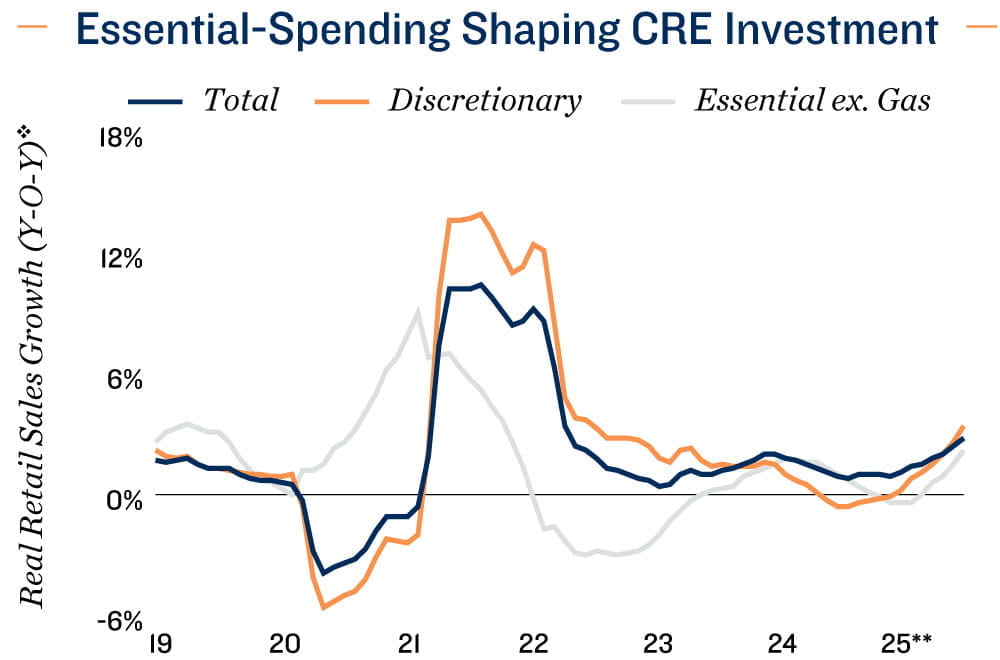 Retail fundamentals remain tight. The retail property sector is also exposed to U.S. tariffs, given their dampening effect on consumer confidence and reduced U.S. demand for smaller businesses due to higher prices. As a result, retail and wholesale employment posted the largest monthly decline in September – down 20,800 positions. That said, domestic spending has held firm, with second-quarter consumer expenditure rising 4.5 per cent annualized. This resilience, coupled with limited construction, has kept Canada’s retail property market exceptionally tight. Vacancy sat at just 2.0 per cent as of the third quarter. These dynamics continue to underpin investor preference for essential-based, grocery-anchored assets.