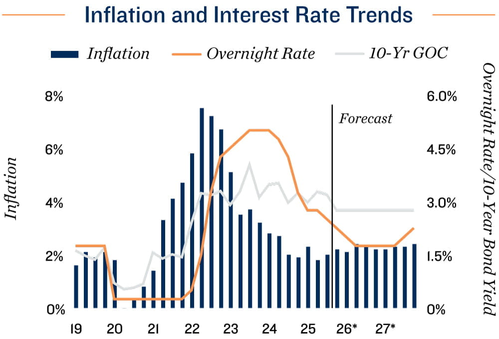 Bond yields ease, offering modest relief to CRE financing. After remaining elevated for much of 2025, Canadian bond yields have trended lower in recent weeks, driven by the United States Federal Reserve’s rate cuts and Canada’s federal government removing retaliatory tariffs. The repricing has narrowed borrowing spreads and provided some relief to commercial real estate financing costs, particularly for long-term fixed-rate debt. However, the downside for yields appears limited. Persistent global tariff tensions and Ottawa’s rising fiscal spending are expected to keep term premiums higher than pre-pandemic norms. While further declines are possible if global growth softens, the bond market is likely to stabilize near current levels. This means capital costs for investors and developers may remain above historical averages even as monetary policy eases.