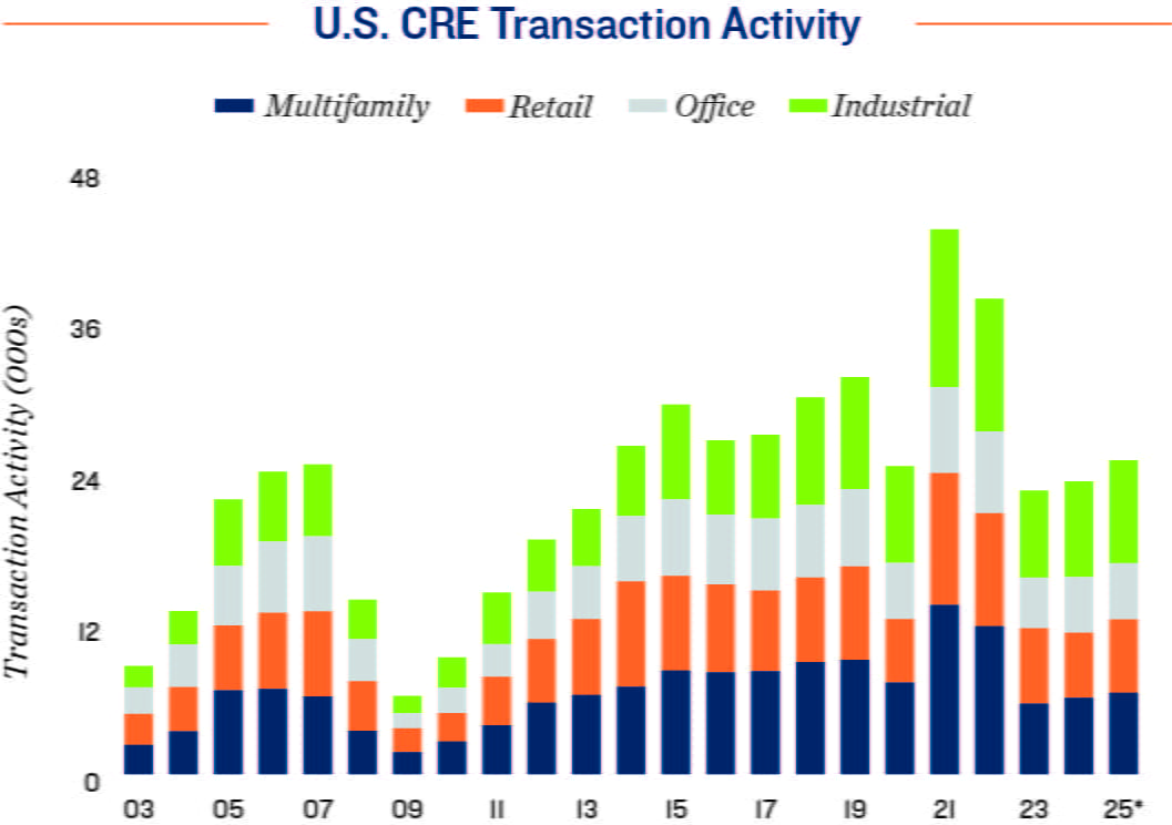 - The number of commercial real estate properties traded over the first half of 2025 was about 10 percent to 15 percent below the pre-pandemic average from 2014 to 2019.