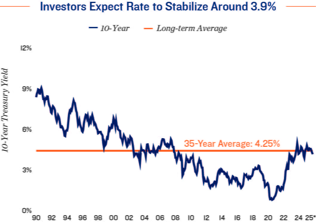 - Many investors expect that the 10-Year Treasury could dip into the upper 3 percent range over the course of next year, a slight decrease from the norm in 2025.