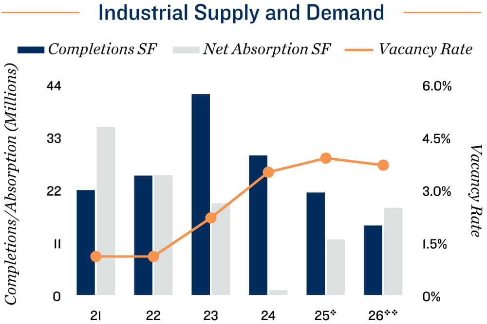 Industrial momentum signals potential market turning point. October’s hiring surge across trade-exposed sectors may mark an early sign that Canada’s industrial real estate market is stabilizing. As these segments regain footing, demand for logistics and production space could begin to firm through early 2026, setting the stage for a gradual improvement in occupancy and absorption later in the year. This outlook is further supported by a more accommodative monetary policy backdrop, which should bolster consumption and business investment, alongside greater clarity on trade policy and the winding-down of Canada’s historic industrial construction cycle. Together, these forces point to a sector transitioning from correction toward renewed balance, with vacancy likely to peak around 4.0 per cent before inching slightly lower next year.