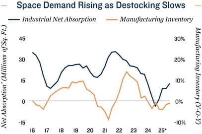 Space demand recovery expected to broaden but remain uneven. Alongside the decent increase in manufacturing sales, declines in inventory levels are also narrowing. This trend is evident in the industrial sector, where space demand has begun to firm up. Trailing 12-month net absorption continued to improve in the third quarter, fuelled by solid demand gains in Alberta and British Columbia. In contrast, activity in Ontario and Quebec has been slower to regain momentum, reflecting a more gradual and delayed recovery in leasing activity as persistent tariff barriers continue to weigh on tenant sentiment in these more trade-reliant markets. Looking ahead, a more broad-based recovery in space demand is expected to take shape as lower borrowing costs bolster manufacturing activity and businesses adapt to the new trade landscape. However, lingering trade disruptions could remain a key headwind for Ontario and Quebec until Canada-U.S. commercial ties improve meaningfully.