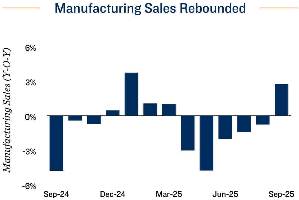 Sales momentum continues to build. Total manufacturing sales rebounded in September, rising 3.3 per cent after a modest decline in August. This monthly gain pushed year-over-year growth back into positive territory, marking the fourth consecutive month of improvement since the measure bottomed in May. The recovery was broad-based across most subsectors and evident in nine provinces. Notably, sales of transportation equipment climbed 9.2 per cent as Ontario-based assembly plants resumed production following summer shutdowns and retooling. In Quebec, sales of aerospace products and parts hit a record high with a 14.9 per cent surge, supported by strong deliveries of business and commercial aircraft and increased production of aerospace engines and parts.