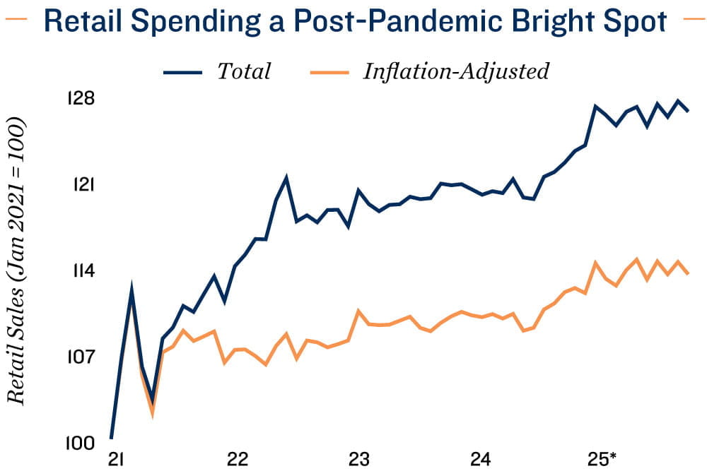 Consumption remains bumpy. Canada’s retail sector lost some ground in September, with sales edging down 0.7 per cent and inflation-adjusted sales slipping 0.8 per cent, marking another month of choppy performance. Despite this soft patch, consumer activity remains as one of the few reliable supports for Canada’s economy. Strength in categories such as food and sporting goods partially offset weakness in autos and building materials, reinforcing that underlying demand — while uneven — remains intact. Taken together, the data suggest that retail spending is no longer running at the pace seen earlier this year, yet it remains a relatively bright spot at a time when other pillars of growth are showing clearer signs of strain.