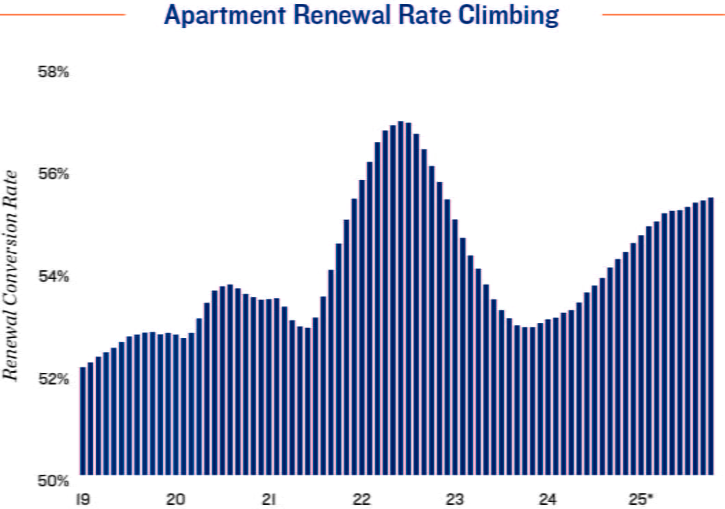 - Declining construction for both single and multifamily housing suggests home prices are unlikely to compress meaningfully, reinforcing the near-term rental-demand outlook.