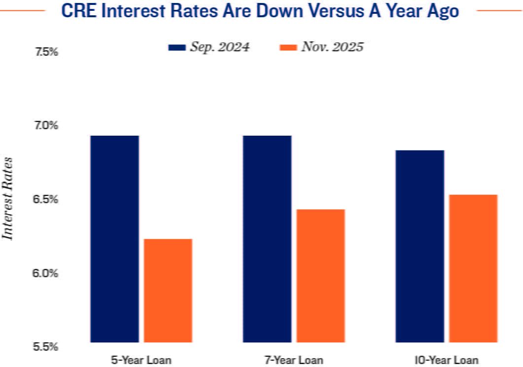 - Increased debt liquidity has in turn bought lower CRE lending rates, with hopes of more Fed rate cuts on the horizon.