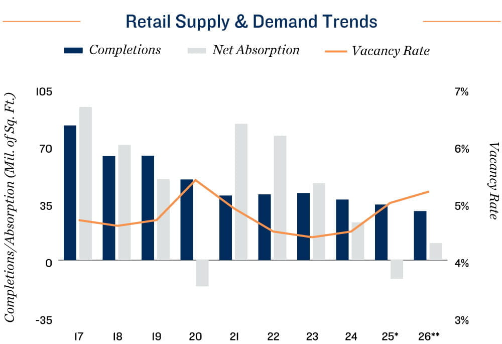 - In the trailing 12 months through the third quarter of 2025, less than 10 million square feet of multi-tenant retail space was constructed — the lowest completion pace since 2012.