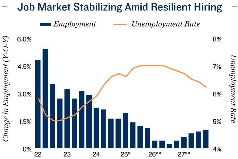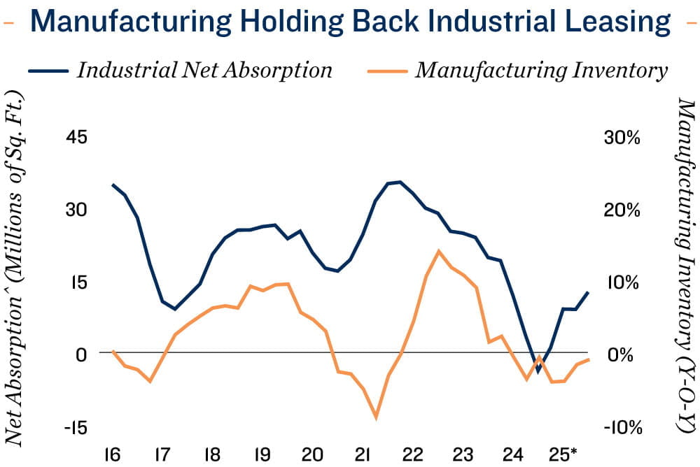 Industrial bifurcation expected. Further job losses in the manufacturing sector highlight rising caution among export-oriented firms navigating tariff exposure. While national industrial fundamentals remain solid — with net absorption improving this year and vacancy hovering around 4.0 per cent by year-end — a softer manufacturing backdrop could temper space expansion plans for heavy-industrial users. Growth is more likely to skew toward logistics, energy-related and transportation users, while Ontario and Quebec manufacturing markets may face slower deal velocity and more conservative footprint decisions. In contrast, energy and logistics-driven markets with more diverse trading partners are better positioned to carry momentum into 2026, even if uncertainty weighs on parts of the export economy.