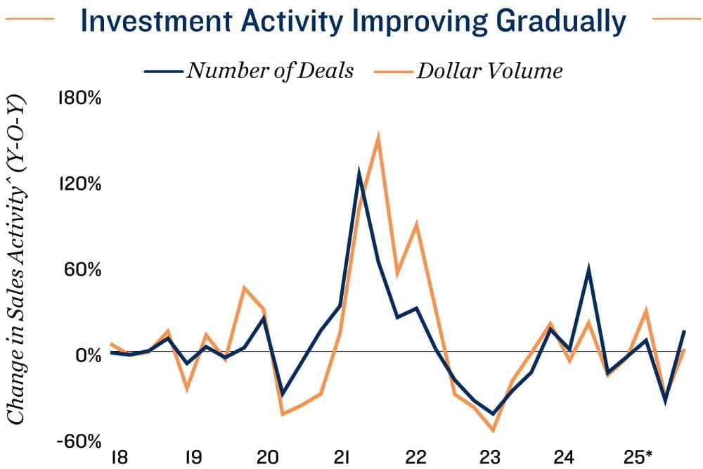 Investment recovery on the horizon. Commercial property sales in Canada improved in the third quarter, with year-over-year gains in transaction count across all sectors. This aligned with expectations that investment activity would rebound amid lower interest rates following the initial trade policy impact. Looking ahead, investor sentiment is expected to continue recovering as financial conditions are likely to remain accommodative through 2026. Moreover, a gradually improving economy — supported in part by measures from the latest federal budget — may further bolster buyer confidence.