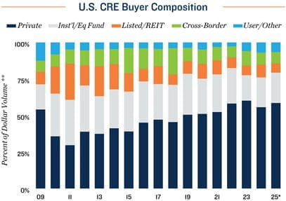 Private investors continue to outpace institutional buyers. The buyer composition of commercial real estate assets has consistently been dominated by privately sourced capital.