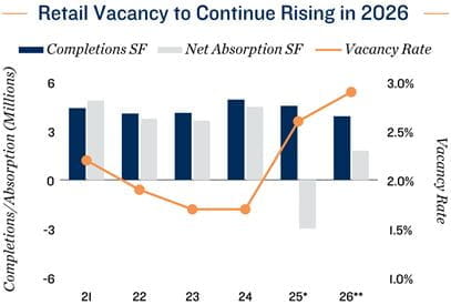 Soft labour market conditions weigh on retail sector recovery. One area of concern in the latest survey is the rising share of businesses planning to reduce their employee headcount over the next 12 months. This caution is echoed in the latest consumer expectations survey, which shows an increase in the share of consumers concerned about potential job losses and missing a debt payment. Together, these dynamics may exert downward pressure on consumer spending in the near term. Combined with persistent uncertainty surrounding U.S. trade policy and a slowing pace of population growth, retailers are likely to remain hesitant to expand their physical storefronts, resulting in a measured recovery in retail space demand. As a result, the retail vacancy rate is forecast to rise in 2026 as net absorption lags behind completions for another year.