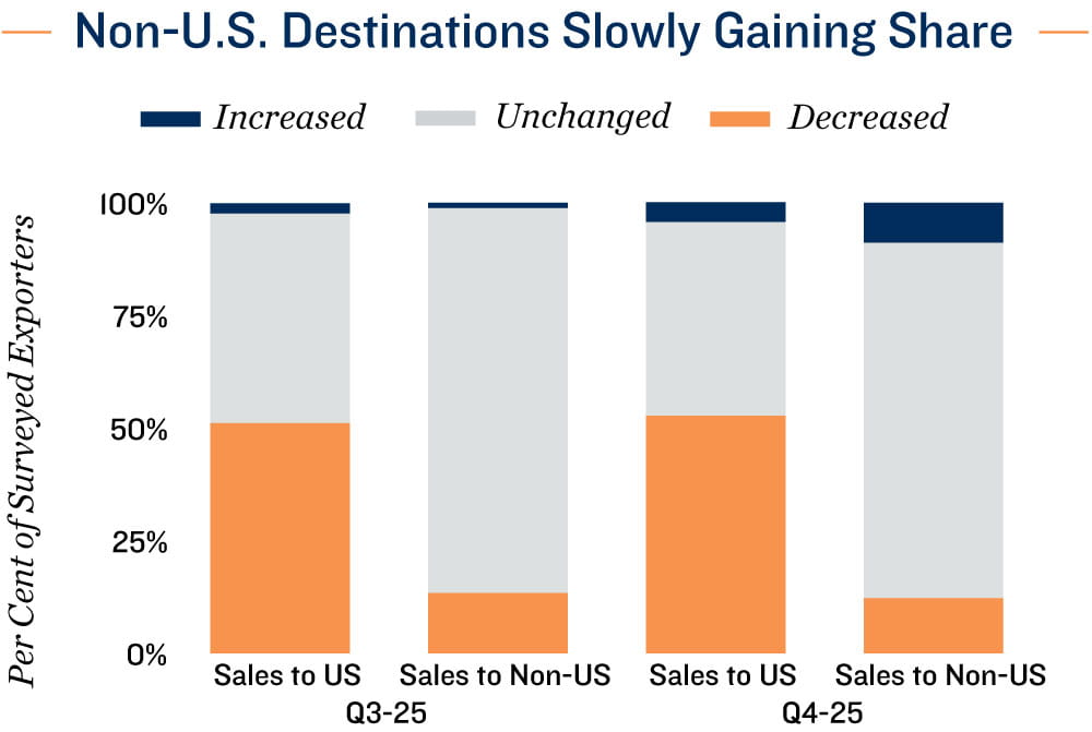 yet to diversify meaningfully, reflecting barriers such as the need to invest in specialized equipment, comply with foreign regulatory requirements, and absorb higher transportation costs associated with serving more distant markets. Looking ahead, as the government continues to promote trade diversification, a broader set of exporters is likely to expand into non-U.S. markets. In addition, recent improvements in Canada-China trade relations could further lift business sentiment, an effect that may become more evident in survey results later this year.