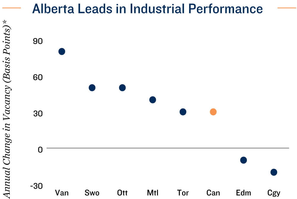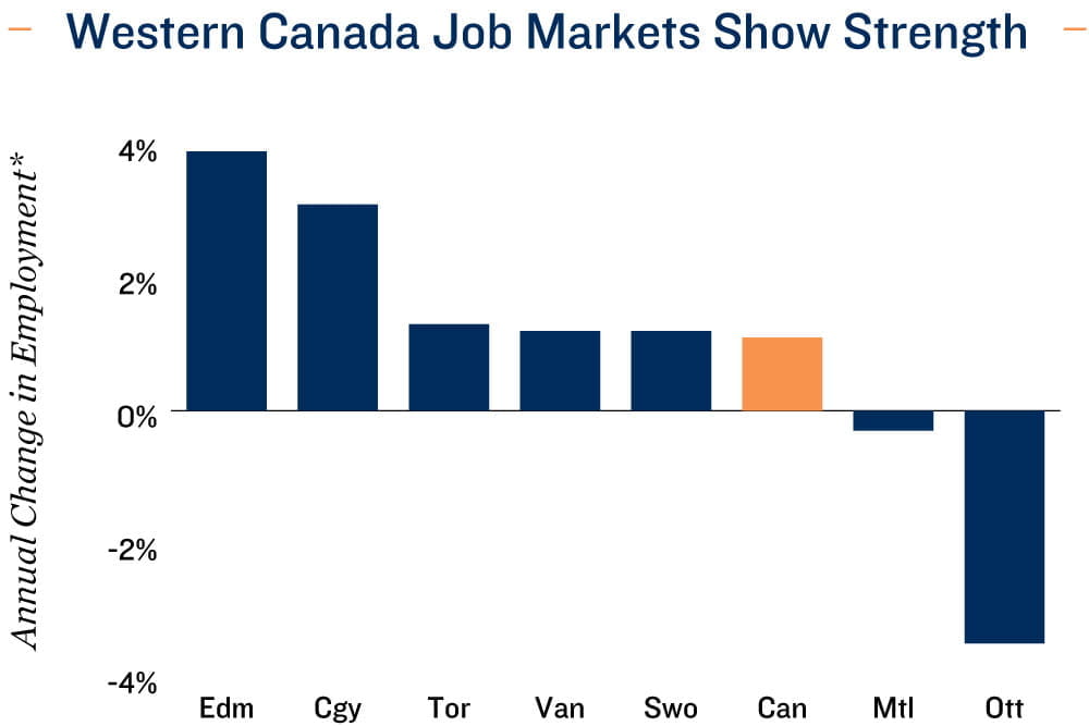 Alberta metros outperform. Edmonton and Calgary led the nation in job gains last year. Vancouver also outpaced the national average, supported by economies less exposed to protectionist U.S. trade. Energy production, natural resources, and infrastructure investment provided a more stable base, while greater access to Asian markets via the Pacific supported greater economic activity and employment< prospects. This relative labour market strength translated into more resilient commercial real estate fundamentals, particularly in Alberta for industrial and multifamily assets. Stronger job creation and sustained population inflows have underpinned tenant demand, limited vacancy expansion, and supported rent growth. This reinforces Western Canada’s position as one of the more defensive and growth-oriented regions for CRE investment heading into 2026.