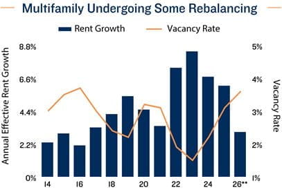Balance returning to residential markets. Canada’s multifamily sector entered 2026 with healthy fundamentals that are normalizing after an exceptionally tight cycle. In 2025, apartment vacancy rose 90 basis points to 3.1 per cent, while annual rent growth moderated 60 basis points to 6.1 per cent, reflecting evolving supply-demand dynamics. Vacancy is expected to climb further into the 3.5 per cent range this year, with rent growth continuing to moderate. This is being driven primarily by elevated openings, as purpose-built rental completions remain high and investor-owned condos continue to flow into the rental pool. Meanwhile, tighter immigration is pushing population growth toward zero. These dynamics are likely to continue to place upward pressure on vacancy and cap rent growth over the short to medium term. That said, underlying conditions remain strong, supporting stable and reliable long-term cash flow.