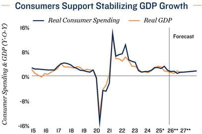Online softness converges with a stabilizing industrial sector. E-commerce activity continued to soften in November, with online sales down 2.8 per cent monthly and accounting for just 5.7 per cent of total retail trade — the lowest since late 2023. The cooling online demand parallels evolving conditions in Canada’s industrial sector, which opened 2025 with nearly five million square feet of positive net absorption before tariffs halted momentum, pushing absorption negative in the second quarter and keeping it subdued in the third. As interest rate visibility improved and trade headwinds eased, leasing strengthened notably in the fourth quarter. Vacancy followed the same trajectory — tightening early in the year before drifting up and stabilizing around 3.8 per cent by December. Looking ahead, interest rate visibility, a smaller build pipeline, firmer trade clarity, and infrastructure investment should support a gradual improvement, with national vacancy poised to trend down to around 3.5 per cent.