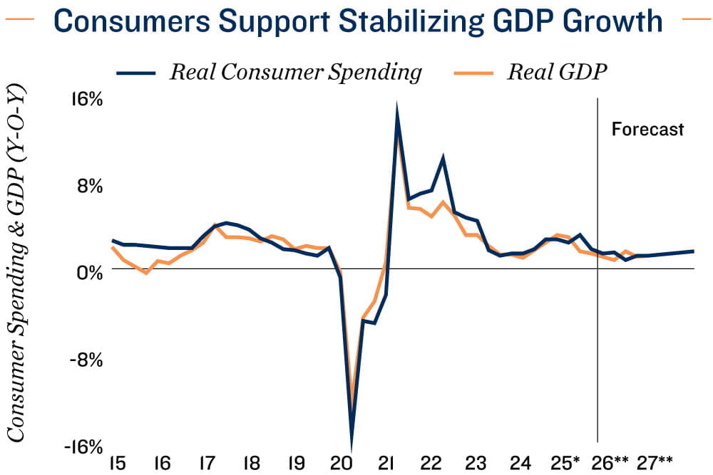 Retail properties well positioned. Canada’s retail property sector softened in 2025, with vacancy rising 90 basis points to 2.6 per cent amid the Hudson’s Bay closures, muted population growth, and broader economic uncertainty. Household consumption even contracted slightly in the third quarter, underscoring the pressure on discretionary categories. Vacancy is expected to edge higher in 2026 to just under 3.0 per cent as demand remains tempered and modest new supply comes online. Even so, underlying fundamentals remain solid, with grocery-anchored centres continuing to attract steady leasing demand and standing out as the preferred investment segment.