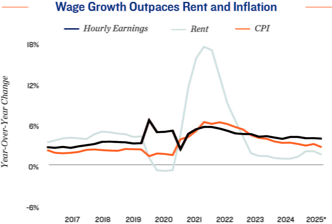 Apartment affordability continues to improve. The gap between wage and rent growth has widened, enhancing the financial capacity of many renter households