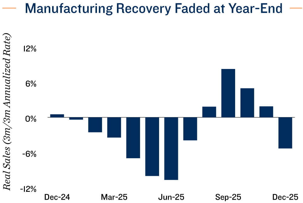 Near-term pressure persists as USMCA joint review approaches. For 2025 as a whole, the manufacturing sector remained subdued. The year began with the initial tariff shock in the first half, followed by a short-lived recovery that lost momentum toward year-end. In real terms, annual shipments declined in 16 of 21 sectors, led by a 12 per cent drop in textile products and an 11 per cent contraction in paper manufacturing. Petroleum and coal products — a key pillar of Canada’s economy — recorded a 5.2 per cent decline in sales amid higher U.S. tariffs. Looking ahead, tariff impacts are likely to persist until at least mid-2026, when the joint review of the USMCA is scheduled. This extended period of trade barrier is likely to keep the manufacturing sector on fragile footing in the near term.