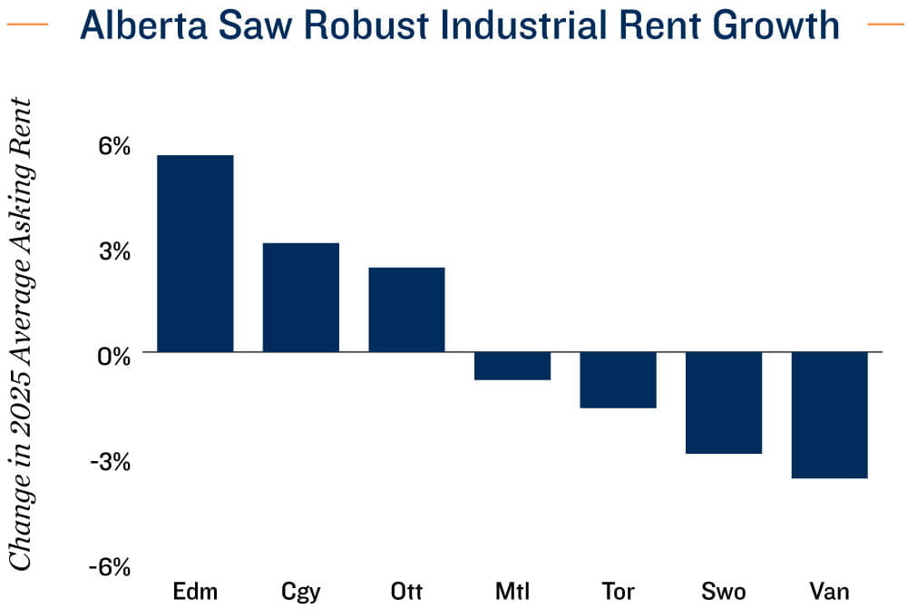 Economic reforms serve as next catalyst for industrial sector. While the manufacturing activity remained soft, the industrial properties at large proved resilient last year. The vacancy rate rose only modestly, by 20 basis points, supported by a rebound in net absorption alongside lower completions. This suggests that businesses largely viewed trade frictions as a temporary hurdle and resumed leasing activity after the initial tariff shock to secure space for longer-term positioning. The momentum was particularly evident in Calgary and Edmonton, where robust demand for space fueled another year of strong rent growth. Looking ahead, while trade relations with the U.S. remain uncertain, Canada’s recent pivot toward internal trade liberalization, export market diversification, and nation-building projects should help support business sentiment, boding well for the industrial sector’s long-term growth.