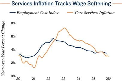 * Services inflation through January 2026. Employment Cost Index through fourth quarter 2025.