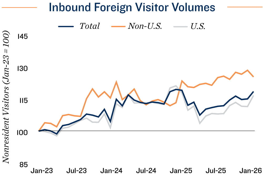 Tourism growth to support inbound travel recovery. Canada’s travel sector has shifted since trade tensions with the United States emerged. Visits by U.S. residents declined 3.0 per cent annually last year, contributing to a 0.6 per cent drop in total international arrivals. Although U.S. travel began recovering in the second half, visitor volumes remained below their 2024 level. In contrast, visits from non-U.S. travellers rose a robust 7.5 per cent, supported by a 9.1 per cent increase in the number of tourists. Inbound travel is projected to continue recovering this year, led by overseas markets — particularly Europe and Asia during the summer peak. While the 2026 FIFA World Cup and the normalization of Canada-Asia air connectivity will support this momentum, any deterioration in trade relations with the U.S. could weigh on inbound travel from Canada’s largest source market, offsetting gains from other markets.