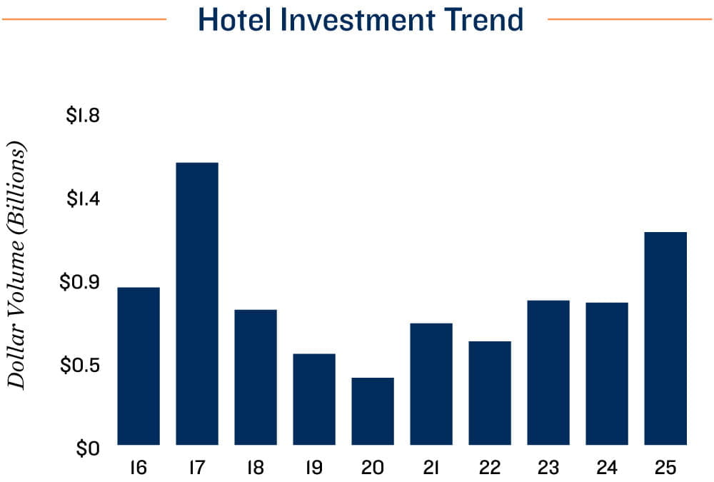 Strong appetite for hotels among investors. Multiple years of strong revenue growth have positioned hotels as highly sought-after assets among investors. Despite softening revenue metrics last year in select trade-dependent metros, total transaction volume reached an eight-year high of over $1.1 billion. The relative scarcity of hotels available for sale, coupled with their strong cash flows and ability to adjust room rates quickly in response to inflation, continues to reinforce their appeal. High-quality hotel properties, in particular, are increasingly viewed as premium assets, attracting intense competition from both lenders and investors