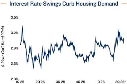Population decline weighs on demand, but expected to recover. Canada’s population contracted year-over-year in the first quarter of 2026 — down 0.2 per cent — marking the first decline on record and reflecting tighter immigration policies. As a key demand driver for residential real estate, this slowdown is weighing on both homeownership and rental markets, contributing to softer absorption and reduced sales activity. However, this pressure is expected to be temporary. Population growth, which has historically been a strong tailwind for housing demand across Canada, is forecast to return to long-term averages by 2028. As a result, while fundamentals are softening now, the longer-term outlook remains intact.