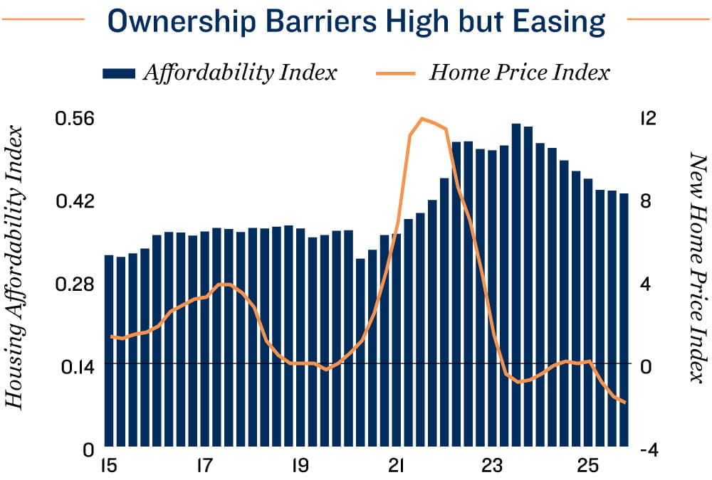 War pressures drive rate volatility. Geopolitical dynamics have had a direct impact on interest rates, with heightened inflation concerns pushing bond yields higher through March and leading to a corresponding increase in fixed mortgage rates. This rate spike has likely kept some prospective buyers on the sidelines during what is typically the most active period of the year, as many wait for improved financing conditions. That said, there are early signs that these pressures may prove temporary. As tensions in the Middle East begin to ease, bond yields have already started to retreat from recent peaks, suggesting that mortgage rates could follow suit in the coming months. If sustained, this moderation in borrowing costs could help reengage buyers over the second half of 2026.