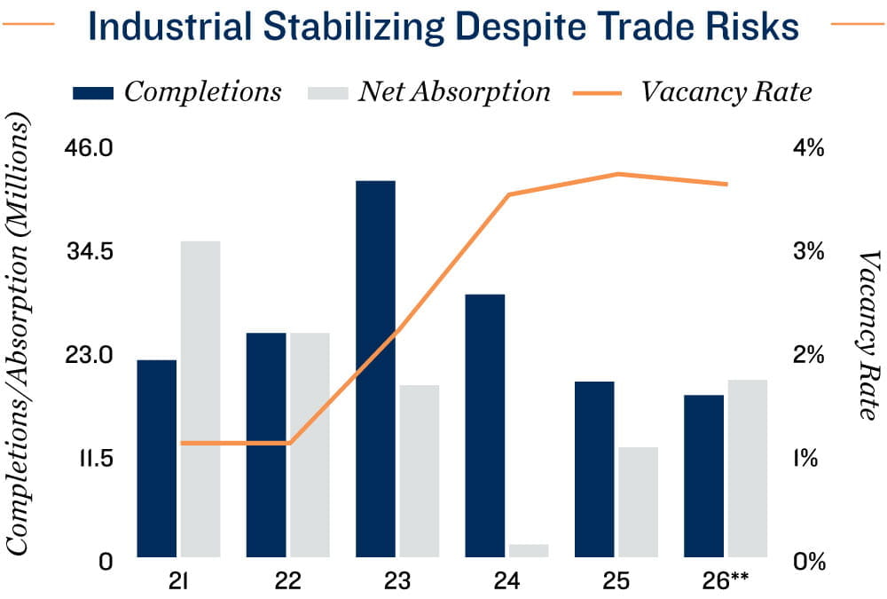 Space demand remains on upward trajectory in select markets. The latest first‑quarter data on net absorption and vacancy rates present an uneven picture of current industrial market conditions. Space demand held up in Toronto, Southwestern Ontario, Vancouver, and Calgary, while leasing activity softened across other major metros after a brief rebound in the second half of last year. In these stronger‑performing markets, tenants have largely looked past trade‑related uncertainty, with leasing decisions increasingly driven by underlying fundamentals such as population growth, supply‑chain reconfiguration, and infrastructure investment. This has translated into improved leasing momentum, particularly for large‑format space, as logistics, distribution, and energy‑related users moved forward with expansion plans.