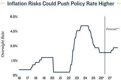 Policy path is uncertain. The Bank’s latest forecast projects GDP growth of 1.2 per cent in 2026, rising to 1.6 per cent in 2027 and 1.7 per cent in 2028, with growth improving as exports and business investment gradually recover. However, the outlook remains clouded by the Iran war, higher energy prices, and ongoing U.S. trade policy uncertainty ahead of the USMCA review. Inflation rose to 2.4 per cent in March and is expected to approach 3.0 per cent in April, though the Bank is currently looking through the immediate energy-driven increase. As a result, any change to the overnight rate is unlikely until officials have greater clarity on the implications of oil-related inflation and evolving trade dynamics. However, if pressures persist, the Bank appears ready to hike interest rates if needed.