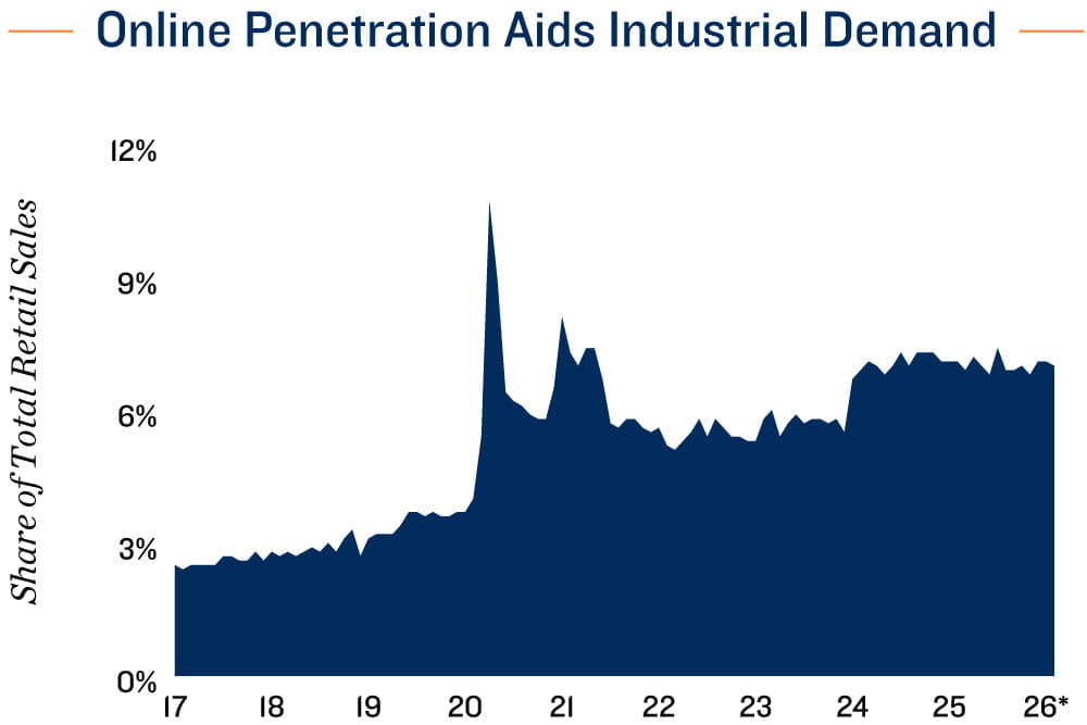 Online spending aligns with stabilizing industrial fundamentals. E-commerce sales declined 0.6 per cent monthly in February, though remained up 2.2 per cent on an annual basis. This points to online spending continuing to normalize, with penetration rates holding relatively steady. For Canada’s industrial property sector, the trend is consistent with broader fundamentals, where vacancy has stabilized around 3.6 per cent and asking rents have levelled off in the $15.00 per square foot range amid dwindling supply-side pressures. Together, these dynamics signal a transition toward more balanced market conditions, with occupier demand shifting from rapid expansion to more selective, efficiency-driven leasing, while still supporting longterm demand for well-located logistics space. As a result, high-quality industrial continues to generate positive investor sentiment.