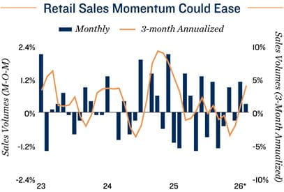 March pullback in spending reinforces rate hold. Preliminary estimates indicate retail sales rose just 0.6 per cent in March, a muted increase given a sharp 19 per cent surge in gasoline prices. Adjusting for price effects, sales volumes likely declined by roughly 1 per cent month-over-month, the weakest reading in at least six months. While first-quarter consumption is still tracking near a solid 4 per cent annualized pace, the weak month-end handoff suggests second-quarter growth will markedly slow. Coupled with declining consumer sentiment, this supports the view that household spending will moderate in the near term, reinforcing expectations that the Bank of Canada will maintain a cautious, hold-oriented stance as it assesses the durability of economic momentum.