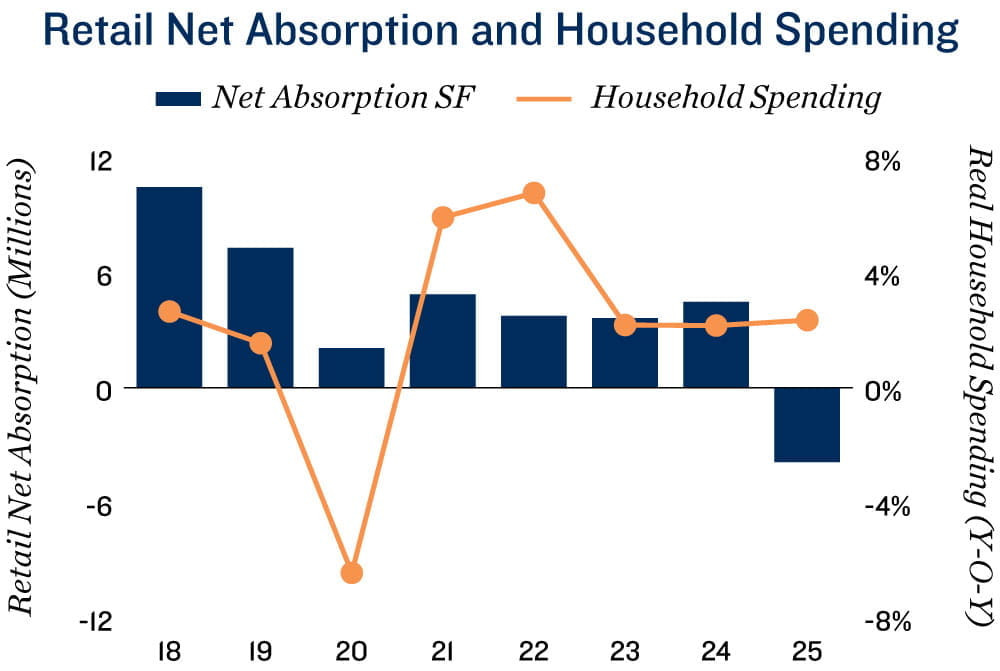 Retailers reluctant to add space amid softening demand signals. While household spending rose 2.3 per cent in 2025 — signalling a healthy consumer sector — this resilience did not translate into stronger retail market performance. Subdued business sentiment amid persistent trade-related uncertainties, coupled with slowing population growth, discouraged retailers from expanding. Combined with the closure of the Hudson’s Bay, net absorption slipped into negative territory in major metros, including Vancouver, Toronto, and Southwestern Ontario. Looking ahead, lower interest rates should continue to underpin consumer spending. However, soft labour market conditions, subdued business confidence, and further tightening in immigration are expected to temper retailer expansion. Consequently, the vacancy rate is projected to approach 3.0 per cent by year-end. While still low by historical standards amid limited new supply, this would mark the highest level since 2017.