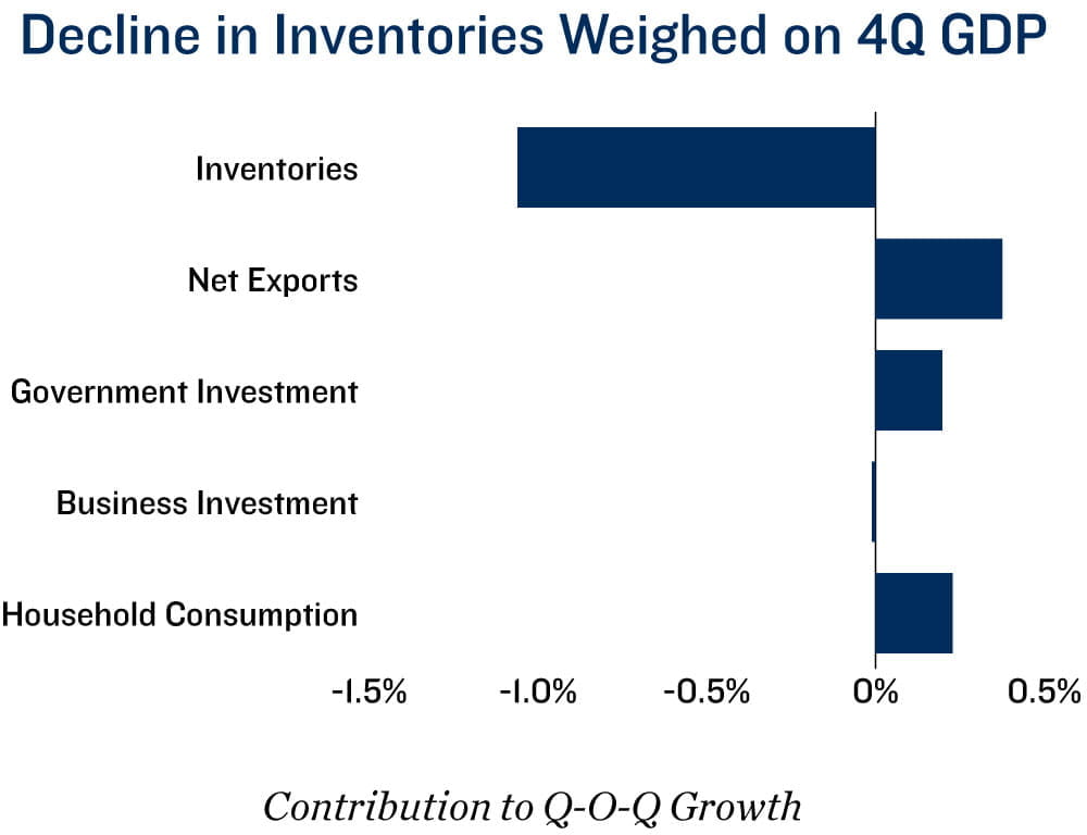 Underlying details healthy despite weak headline. Driven by a drawdown in inventories, Canada’s economy contracted by a 0.6 per cent annualized rate in the final quarter of 2025 — weaker than the consensus expectation for a 0.2 per cent decline. Despite the soft headline print, the underlying composition of growth was more constructive. Household spending rose 1.7 per cent, underpinned by a 3.6 per cent increase in services consumption, suggesting domestic demand remained firm. Investment also improved, rising 3.3 per cent, largely reflecting a 20 per cent surge in public-sector outlays. However, business investment edged down 0.2 per cent, underscoring ongoing caution among firms as trade-related uncertainties continued to weigh on capital expenditure plans. That said, machinery and equipment investment rebounded after two consecutive quarterly declines, potentially signalling the early stages of a tentative recovery in private-sector capital spending.